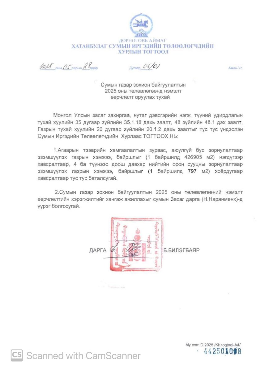 СУМЫН ГАЗАР ЗОХИОН БАЙГУУЛАЛТЫН 2025 ОНЫ ТӨЛӨВЛӨГӨӨНИЙ НЭМЭЛТ ӨӨРЧЛӨЛТ